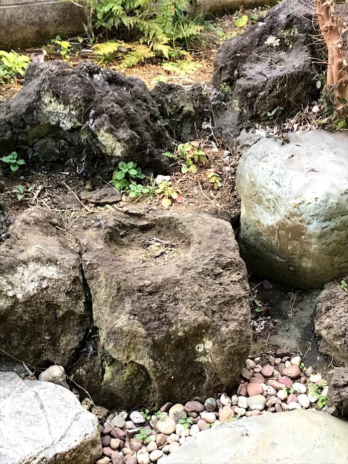 狭い庭に大きな岩や溶岩がごろごろしています。