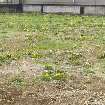 砂利だらけの空き地に、黄色いたんぽぽの群生が。